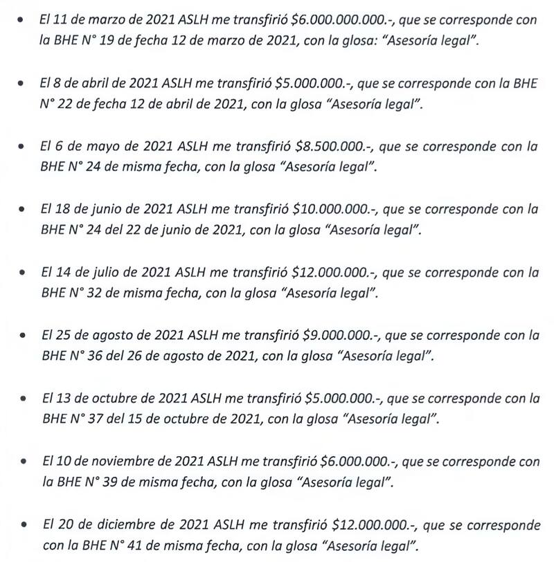 En síntesis, respecto de este primer contrato, sumando las transferencias con sus respectivas BHE de respaldo junto con el monto transferido a CHACO S.A. con la respectiva factura de respaldo, da un monto total de $59.404.309, que, dividido entre 12 meses, duración del primer contrato, da un total de $4.950.359,08 mensual, logrando aproximarse a los honorarios mensuales que había pactado en el contrato de prestación de servidos a honorarios de fecha 2 de marzo de 2020 suscrito con ASLH.