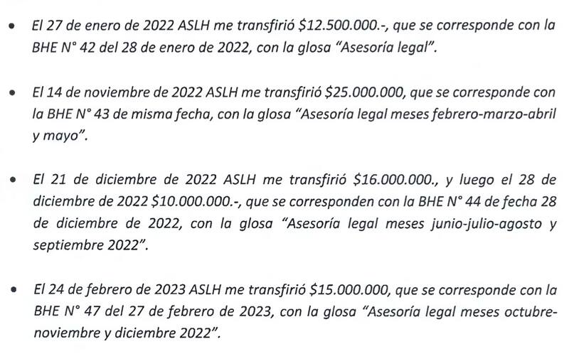 Eso dio origen al pago de honorarios desde su sociedad, debidamente respaldados con boletas emitidas y documentadas en los momentos correspondientes y las glosas respectivas. Al principio los pagos y emisión de boletas era ordenado, pero luego fue variando, dependiendo de la dinámica propia de una oficina de abogados, esto es, si los clientes pagaban, si llegaban nuevos clientes, aporte de clientes que pudiese haber hecho o diligencias propias de mi labor de asesor.