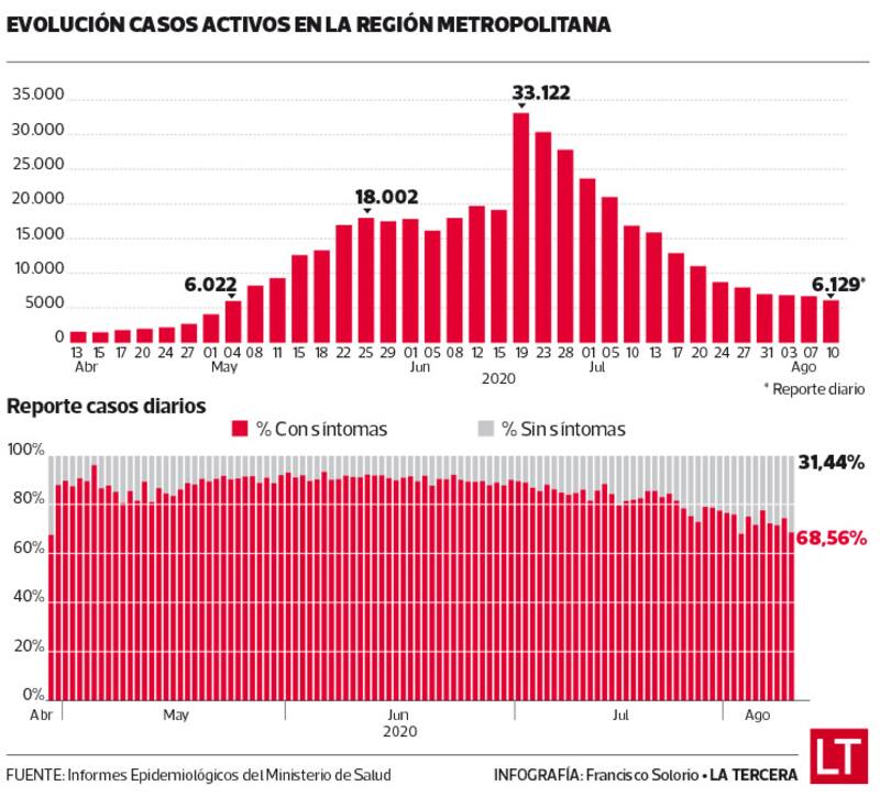 El lunes, el Minsal informó que los nuevos casos han caído 10% a nivel nacional en los últimos 14 días, mientras que la positividad del testeo alcanza un 8% en el país y 7% en la RM . “Mantenemos la preocupación por la evolución de la pandemia”, dijo el ministro, Enrique Paris.