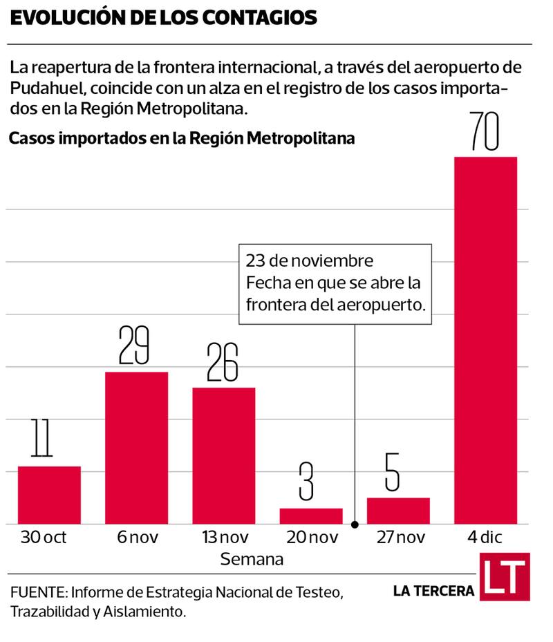 Cuando han pasado cerca de dos semanas desde la implementación de la medida, el último informe de la Estrategia Nacional de Testeo, Trazabilidad y Aislamiento -que abarca la semana entre el 28 de noviembre y 4 de diciembre-, dio cuenta que en ese periodo los nuevos casos importados de Covid en la Región Metropolitana alcanzaron los 70 contagiados. En la semana inmediatamente anterior, la cifra había sido de cinco.