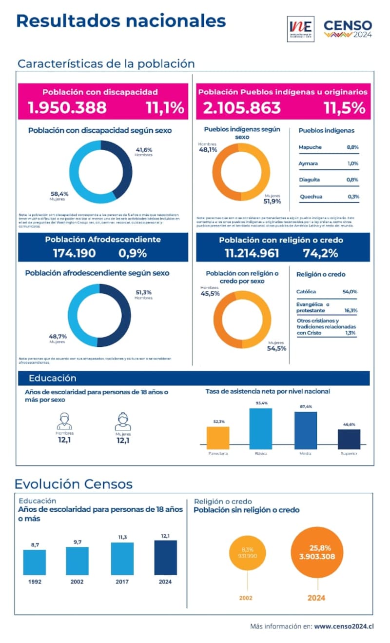 El Instituto Nacional de Estadísticas (INE) concretó este lunes una nueva entrega de los resultados del Censo 2024, detallando en esta oportunidad información sobre temáticas como pertenencia a pueblos originarios, población afrodescendiente, población con discapacidad, género, religión, credo y nivel educativo.