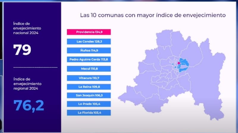 En tanto en la Región Metropolitana, las comunas del sector Oriente son las que tienen mayor índice de envejecimiento.