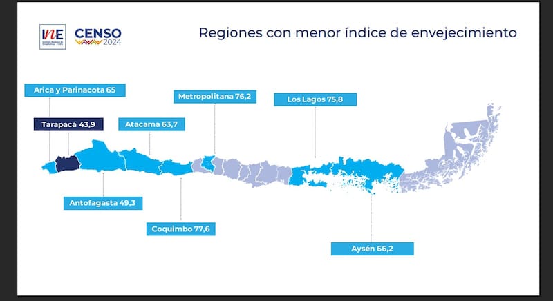 Las regiones con menores índices de envejecimiento son Tarapacá (43,9), Antofagasta (49,3), Atacama (63,7), Arica y Parinacota (65), Aysén (66,2) Los Lagos (75,8).