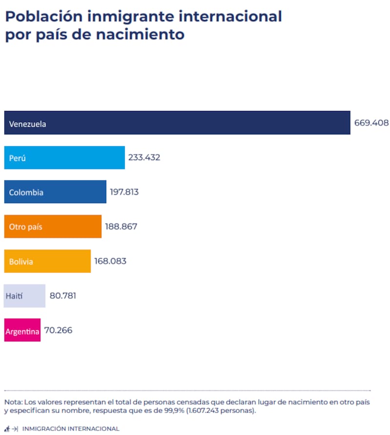 “El principal país de nacimiento de la población inmigrante es Venezuela, en el año 2017 era Perú, y en 2002 y 1992 era Argentina. O sea, han ido cambiando las características de las personas que van llegando a residir al territorio nacional”, detalló.