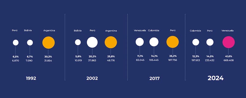 Alvarado explicó que “en el año 1992 teníamos 105.070 personas, luego 187.008 (2002), 746.000 (2017), y que en el Censo del año 2024 fueron censadas 1.608.650 personas inmigrantes internacionales“. Es decir, un aumento cercano al 115% si se comparan las últimas dos cifras.