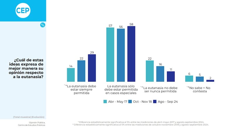 Eso sí, existe un aumento en las personas que consideran que la eutanasia debe permitirse en todos los casos, así como una disminución en quienes rechazan esta medida (ver la infografía).