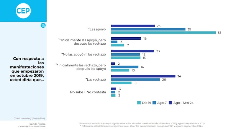 El Centro de Estudios Públicos (CEP) compartió los resultados de su última encuesta realizada entre el 2 de agosto y el 12 de septiembre de 2024, donde se le consultó a los participantes sobre su evaluación de las manifestaciones que se desarrollaron desde octubre de 2019 hasta marzo de 2020, en el denominado estallido social.