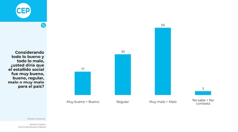 Y ante aquella pregunta, el 50% señaló que el estallido social fue “muy malo o malo” para el país. Mientras que un 30% lo considera “regular” y un 17% “muy bueno o bueno”.