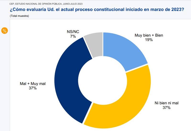 Además, se les consultó a los encuestados sobre la evaluación del actual proceso constitucional iniciado en marzo de 2023. Los resultados arrojaron que un 37% calificó el proceso como “mal o muy mal”, un 37% “ni bien ni mal” y un 19% “muy bien”. Respecto de esa última cifra, se estableció que quienes mejor evalúan el proceso son hombres de entre 45 y 59 años y habitantes de zonas rurales.