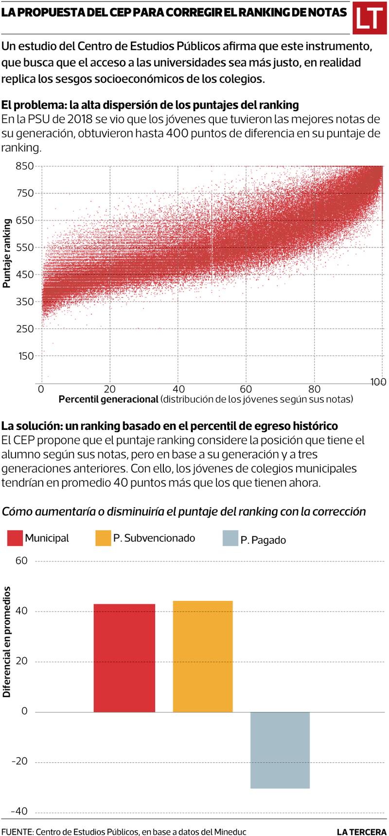 Sylvia Eyzaguirre, investigadora del CEP y autora de la propuesta, explica que, si se aplicara este nuevo instrumento, los jóvenes de colegios municipales y particulares subvencionados tendrían en promedio 40 puntos más en su puntaje de ranking, mientras que los de colegios particulares pagados tendrían cerca de 30 puntos menos, lo que equilibraría la balanza (ver infografía).