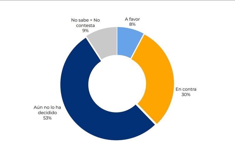 Al respecto, la encuesta reveló que, considerando lo que el encuestado “ha visto hasta ahora”, un 53% aún no ha decidido qué opción votará, mientras que un 30% se inclina por la opción ‘En contra’ y un 8% por el ‘A favor’.