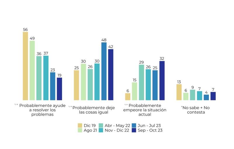 Los resultados arrojaron diferencias significativas con mediciones anteriores. En 2019, un 56% pensaba que una nueva Constitución “Probablemente ayude a resolver los problemas”. En este último estudio, solo un 19% se inclinó por esa opción.