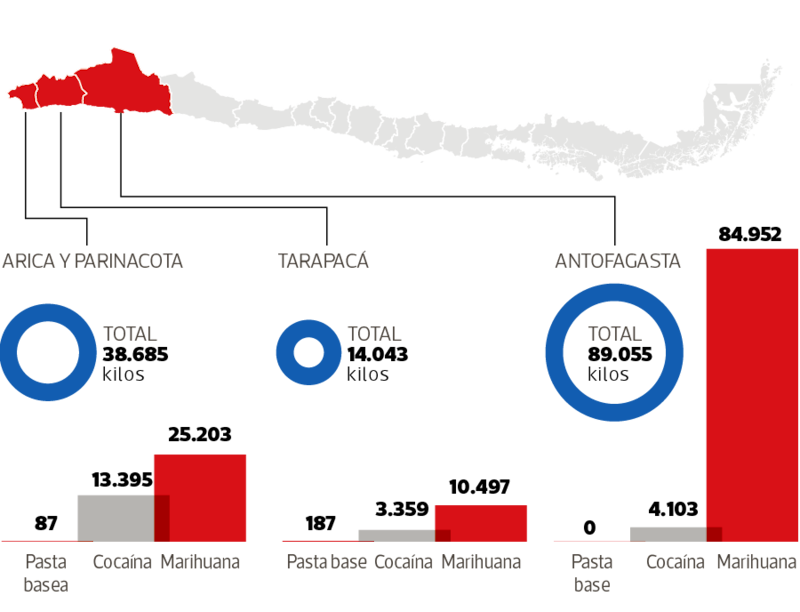 Por ejemplo, según la Fiscalía Nacional, entre 2015 y 2019 ingresaron a territorio nacional 141 mil kilos de droga por las tres regiones del norte.