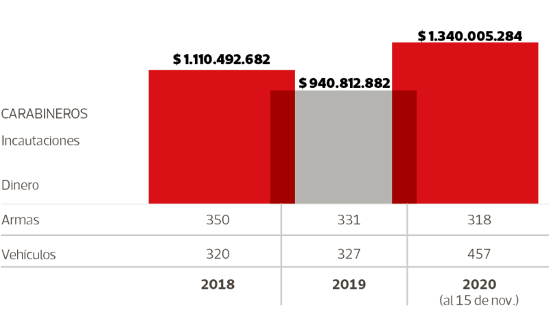 Junto a las drogas, el trabajo de Carabineros también se enfoca en requisar los bienes que obtienen las bandas a raíz del tráfico de drogas.