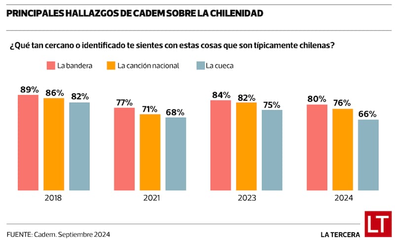 El estudio también pesquisó una baja respecto a la identificación de asuntos que son típicamente chilenos en comparación a años anteriores. La bandera, por ejemplo, en 2018 se posicionó como la mayor de las preferencias con un 89%. Independientemente de que aún se mantenga en el primer lugar, la valoración de ese símbolo patrio bajó de 89% en 2018 a 80% este año. En el caso del himno nacional, bajó de 86% hace seis años a 76%, mientras que la cueca pasó de 82% en 2018 a 66% en 2024.