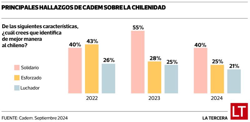 La encuesta también ahondó en la percepción que los chilenos tienen sobre sí mismos. Lo “solidario” lidera la lista, con un 40%, 15 puntos menos respecto de 2023. Otras características mencionadas fueron “esforzado” (25%), “luchador” (21%) y “chaquetero” (21%).