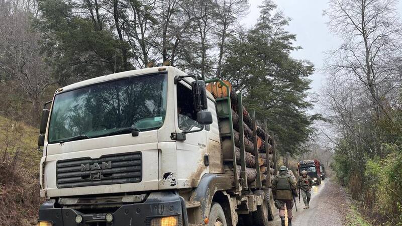 Los sujetos fueron aprehendidos en flagrancia mientras transportaban cinco camiones cargados con madera sustraída desde un predio de Forestal Mininco, en la comuna de Los Sauces.