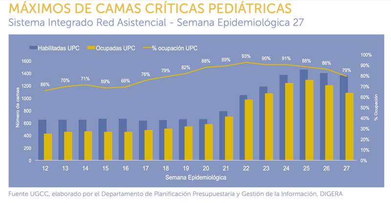 Según las cifras que informó la jefa de la División de Gestión de la Red Asistencial (DIGERA), Fabiola Jaramillo, con fecha de corte 16 de julio del 2023 se reportan 1.250 camas críticas pediátricas habilitadas en el sistema integrado público-privado, lo que implica un aumento de 69,4% con respecto a las 738 camas de dotación basal.