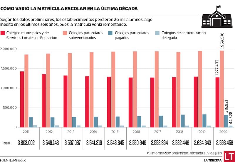 Hace unas semanas, el Mineduc informó al Congreso las cifras preliminares de matrículas al mes de julio, las que indicaban una pérdida incluso mayor de alumnos en el sector particular pagado, que llegaba al 4,8%, y que establecía que el país contaba con 3,6 millones de escolares.