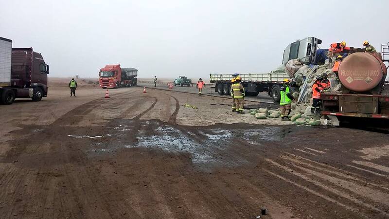 A las 11.00 horas de esta mañana se registró una colisión entre dos camiones en el cruce Taltal, ubicado en la Ruta 5-Norte. Uno de ellos, trasladaba ácido sulfúrico.
