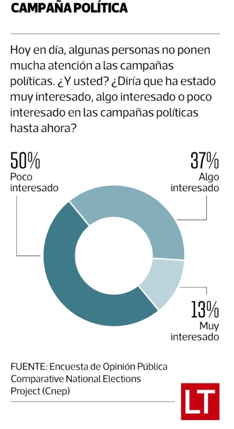 El estudio también exploró la relación de las personas con la campaña electoral. Un 50% reconoció estar “poco interesado”, 37% “algo interesado” y 13% “muy interesado”. El involucramiento digital es igualmente bajo: 71% no ha entregado apoyo online a protestas en las últimas semanas y 58% no ha recibido ni compartido información política vía redes o mensajería.