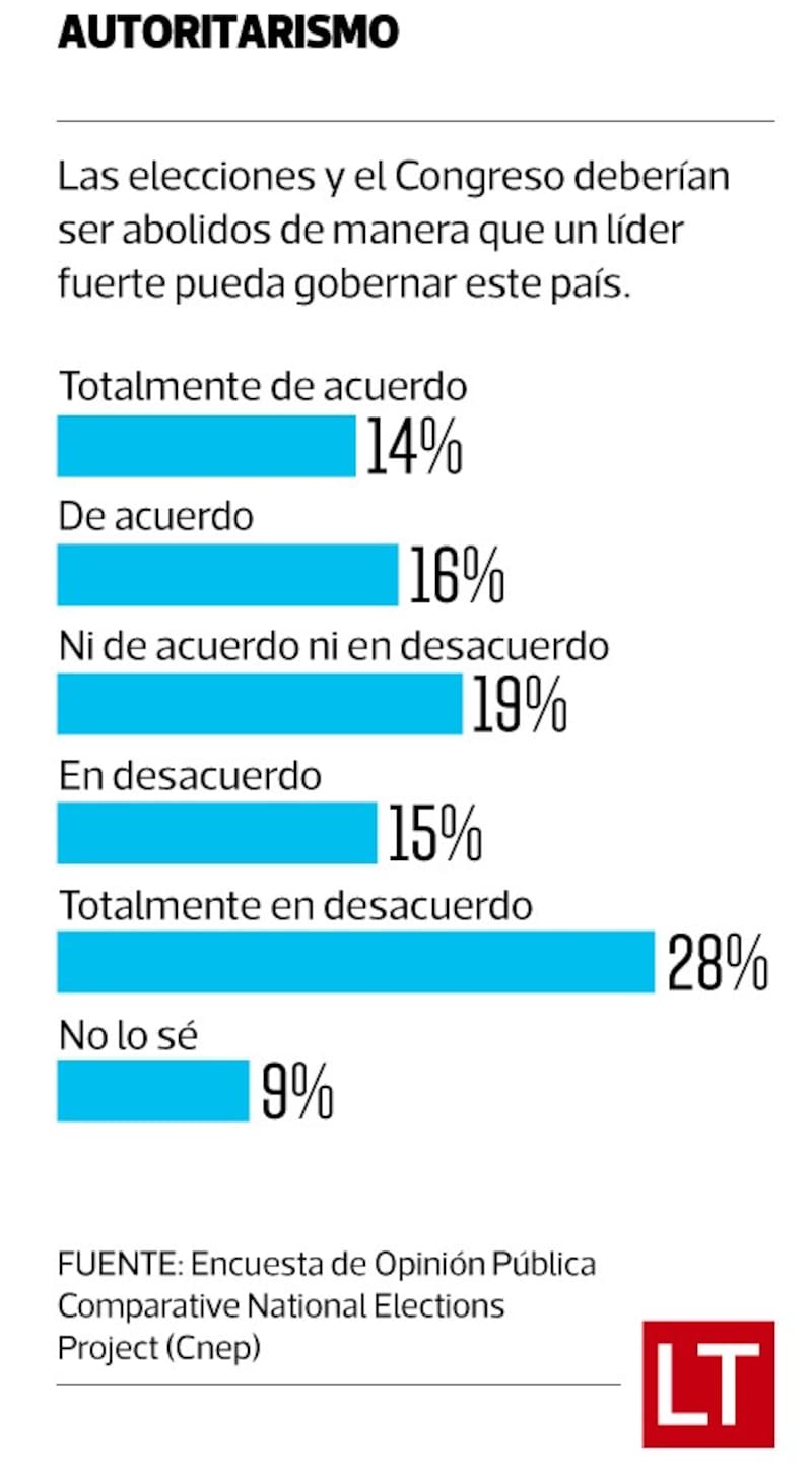 El 81% consideró “muy importante o importante” contar con un líder fuerte, y 65% otorgó esa relevancia a la unidad nacional y al patriotismo. Incluso, un 30% dijo estar “de acuerdo o totalmente de acuerdo” con la idea de abolir el Congreso y las elecciones para que un líder fuerte gobierne. Esa adhesión supera al 28% que rechaza la afirmación.