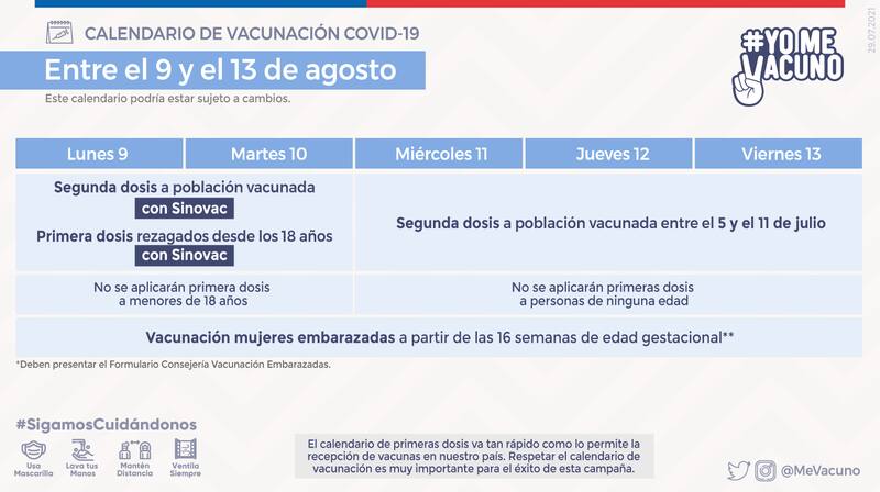 En tanto, para la semana del 9 y 13 de agosto, el lunes 9 y martes 10 se vacunarán con primera dosis de Sinovac los rezagados mayores de 18 años y los que correspondan con segunda dosis también de Sinovac. Al igual que la primera semana de agosto, durante esos dos días no se aplicarán primeras dosis a menores de 18 años.