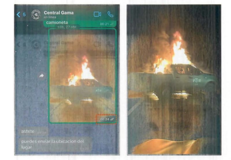 Una fotografía de la camioneta en que se trasladaban los funcionarios policiales envuelta en llamas fue uno de los primeros registros que se tuvo de lo sucedido, por lo que su difusión fue indagada en medio de las pericias lideradas por el fiscal Roberto Garrido.