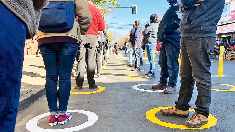 En Rancagua, luego de que iniciara la pandemia, se comenzaron a implementar medidas: en las calles San Martín y Brasil, sector donde hay gran cantidad de oficinas públicas y bancos, se destinó una parte de la calzada para que las personas estén en “zonas de espera seguras”. Así, se pintaron 3.000 círculos para que quienes deseen realizar sus trámites aguarden antes de ingresar a los edificios.