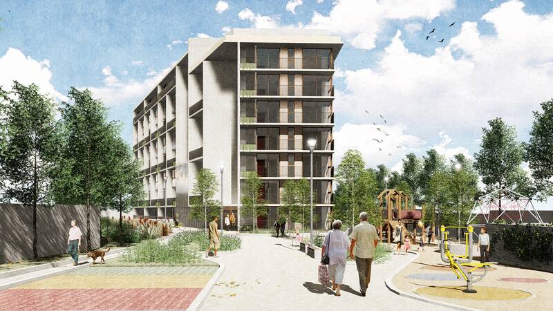 La torre de 60 departamentos estará emplazada en un terreno municipal de 2.000 m² y también contará con dos tipos de viviendas de 59 mm², distribuidas en 5 pisos: dúplex y simples, con 2 o 3 dormitorios y 2 baños.