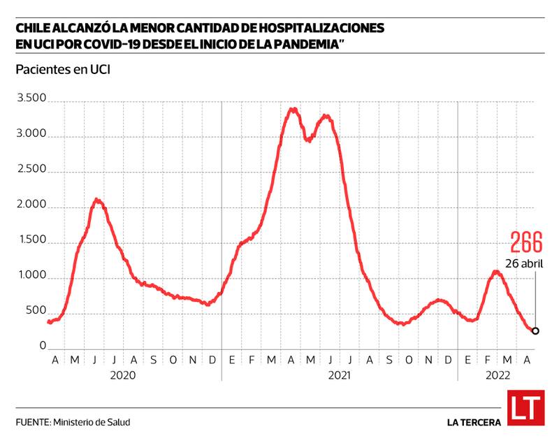Tras más de dos años, el pasado lunes 25 de abril se informó que había 263 pacientes en una unidad crítica por coronavirus. Esta es la menor cantidad de pacientes en UCI desde el inicio de la pandemia, cuando los primeros registros -16 de abril de 2020- informaban que había 384 contagiados que requerían cuidados complejos (ver gráfico).