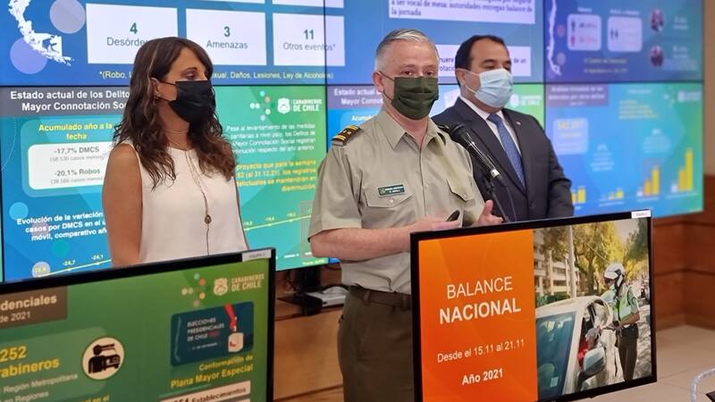 Galli, junto a la subsecretaria de Prevención del Delito, María José Gómez, y al director nacional de Orden y Seguridad de Carabineros, general inspector Marcelo Araya, entregaron un balance de la labor semanal de Carabineros en dependencias de la Dirección General de la policía uniformada.