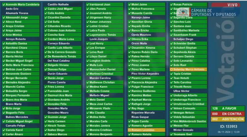 Poco antes de las 14.00 horas, se realizó la votación. El proyecto fue aprobado por 128 votos a favor, ninguno en contra y dos abstenciones.