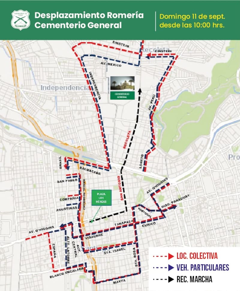 Este domingo, como cada 11 de septiembre, se llevará a cabo una romería al Cementerio General en conmemoración de las víctimas del golpe de Estado. Por ello, Carabineros informó de cortes y desvíos de tránsito en las comunas de Santiago y Recoleta para esta jornada.