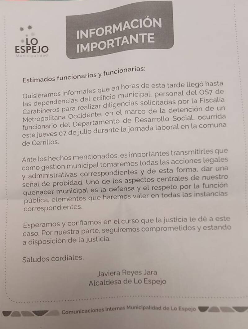 Tras su detención, el OS7 de Carabineros llegó hasta el edificio municipal ubicado en Avenida Central de esa comuna y allanó su oficina, lo que generó preocupación y comentarios entre los demás funcionarios municipales. Por ello, el viernes la alcaldesa Reyes emitió un comunicado interno en el que se informó que las diligencias fueron “solicitadas por la Fiscalía Metropolitana Occidente, en el marco de la detención de un funcionario ocurrida durante la jornada laboral”.