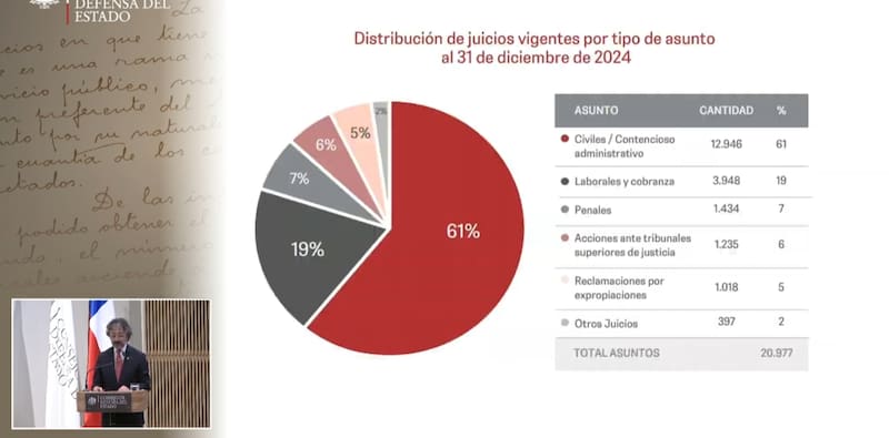 Según agregó, de estos juicios, “un 61% corresponde a causas relacionadas con materias civiles o contenciosas administrativas, un 19% tiene relación con causas laborales y de cobranza, un 7% están relacionadas al ámbito penal, un 6% ante tribunales superiores de justicia, un 5% corresponde al ámbito de las reclamaciones por expropiación, y un 2% a otros juicios especiales”.