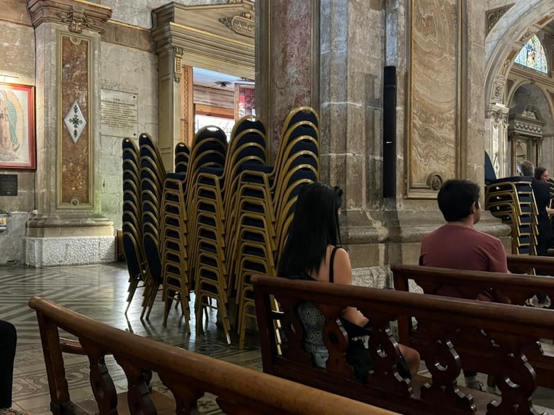 Comienzan los preparativos de la Catedral de Santiago, donde este viernes se realizará la misa por el funeral de Piñera. Encargados de protocolo y de seguridad revisan y ordenan la distribución del lugar.