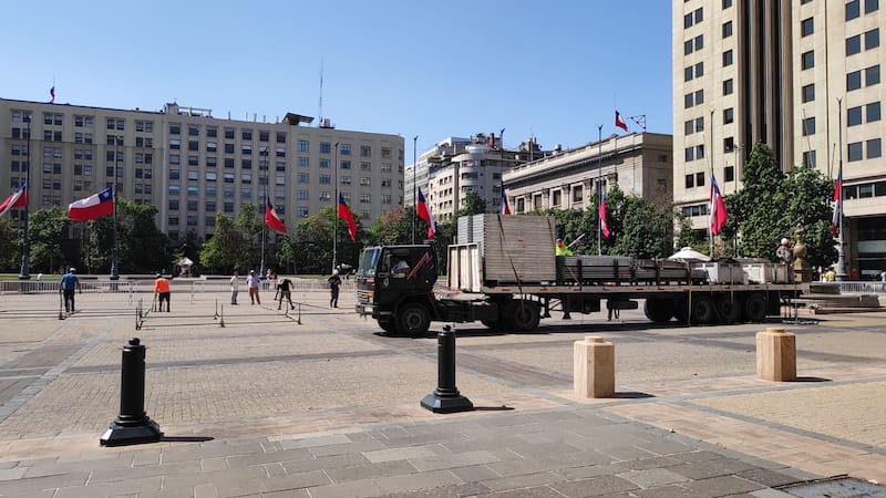 Comienzan a instalar la tarima para la prensa en la Plaza de la Constitución para la despedida final de Piñera en La Moneda.