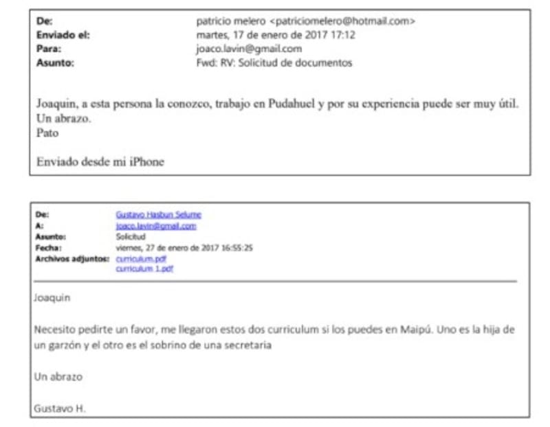 “Joaquín, a esta persona la conozco, trabajó en Pudahuel y por su experiencia puede ser muy útil, un abrazo. Pato”, le escribió Melero, mientras que Hasbún le indicó: “Necesito pedirte un favor, me llegaron estos dos currículum si los puedes en Maipú. Uno es la hija de un garzón y el otro es el sobrino de una secretaria. Un abrazo”.