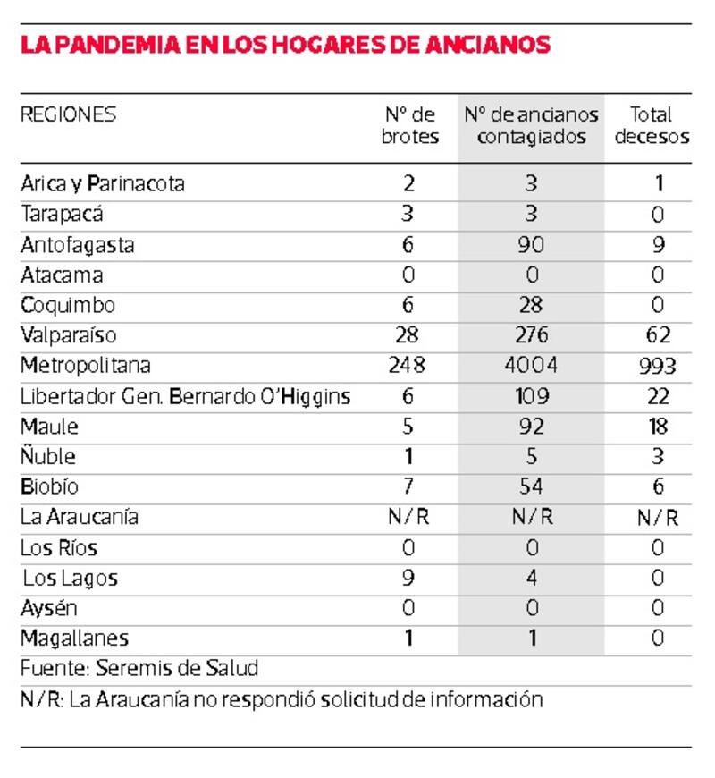 Según datos que recopiló La Tercera por Ley de Transparencia, en el país se han registrado al menos 1.114 fallecimientos de adultos mayores residentes en hogares de ancianos, producto de 322 brotes de coronavirus. Así lo detallan las seremis de Salud, en una cifra que engloba tanto a las residencias a cargo del Servicio Nacional del Adulto Mayor (Senama) como a los recintos privados.
