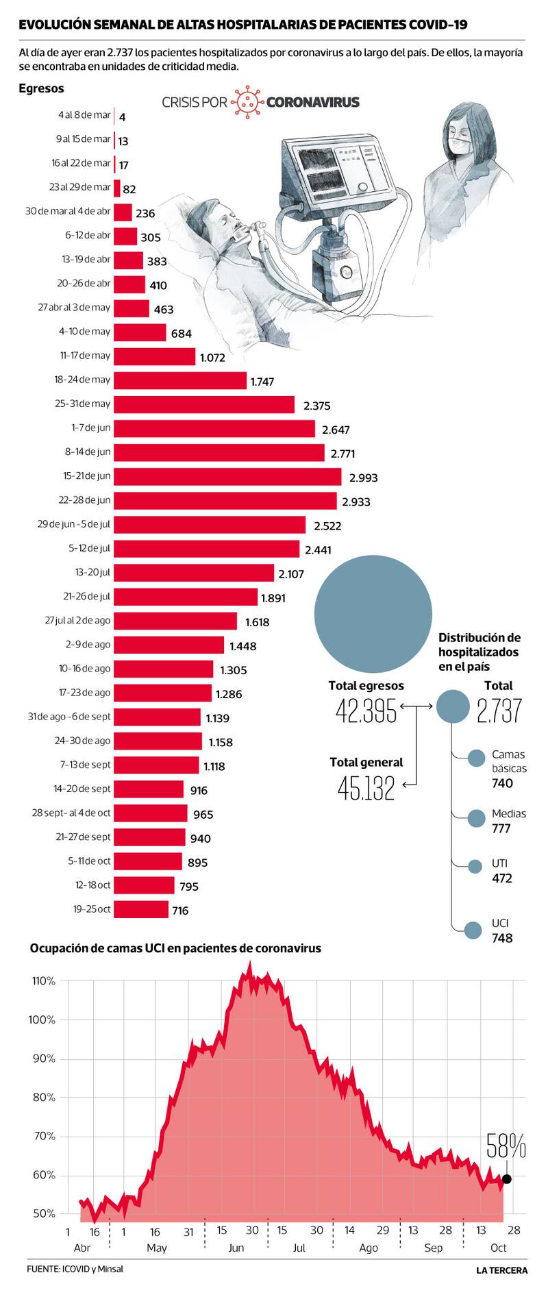 La Tercera accedió al más reciente reporte del Ministerio de Salud sobre egresos hospitalarios por coronavirus, desde el 4 de marzo a la fecha. En este se da cuenta de que, en casi ocho meses, las altas de pacientes desde unidades básicas, intermedias y UCI superan los 42 mil. Eso, sumados los 2.735 pacientes que hasta ayer eran atendidos en centros públicos y privados, eleva a 45.132 las personas que han requerido ser hospitalizadas por Covid-19 a lo largo de la pandemia.