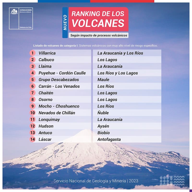 Asimismo, explicó que la nueva versión del ranking contribuye a “aumentar el conocimiento de este tema tan relevante para el país ya que refuerza la labor preventiva ante situaciones de emergencias. Además, hoy se han incorporado volcanes en peligro latente, lo que naturalmente, permitirá dimensionar y analizar el contexto volcánico y sus implicancias en todo el territorio nacional y entregar mayor seguridad a la ciudadanía”.