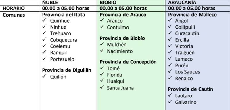 En el marco de los incendios forestales que afectan principalmente a Biobío, Ñuble y La Araucanía, el gobierno informó que las comunas que se verán afectadas por la restricción se irían anunciando por el jefe de defensa nacional de cada región.