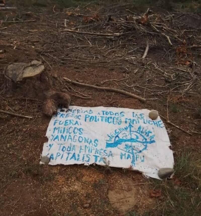 Una de ellas decía: “Libertad a todos los presos políticos mapuche, fuera milicos, yanaconas y toda empresa capitalista. Weichan Anka Mapu”. Otro rezaba: “Fuera los milicos forestales yanaconas, libertad a L. Tranamil , C. Millanao, E. Montoya, Berkhoff, primos Trancal”.