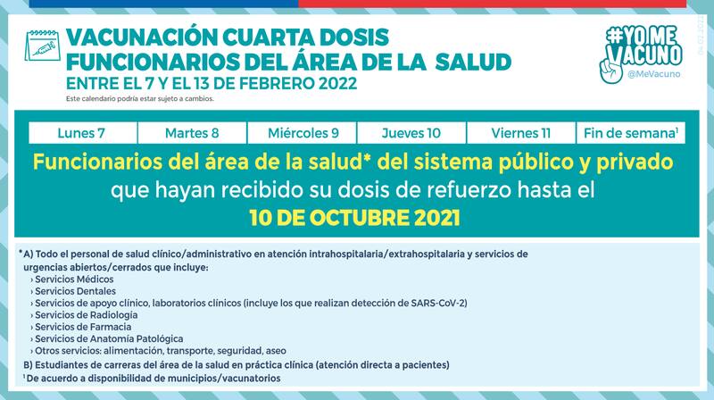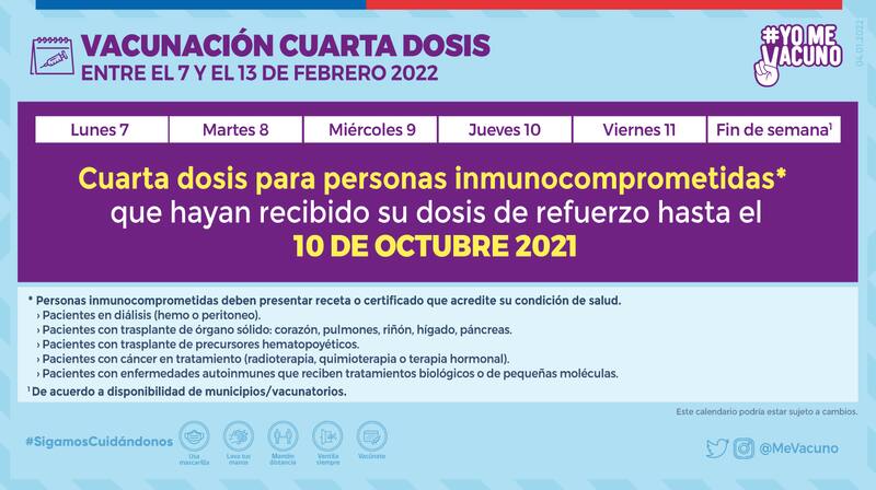 La cuarta dosis, además se estará aplicando también este 5 y 6 de febrero para todos aquellos pacientes inmunocomprometidos que se vacunaron hasta el 3 de octubre de 2021 con la tercera dosis, según la disponibilidad existente en municipios y vacunatorios.