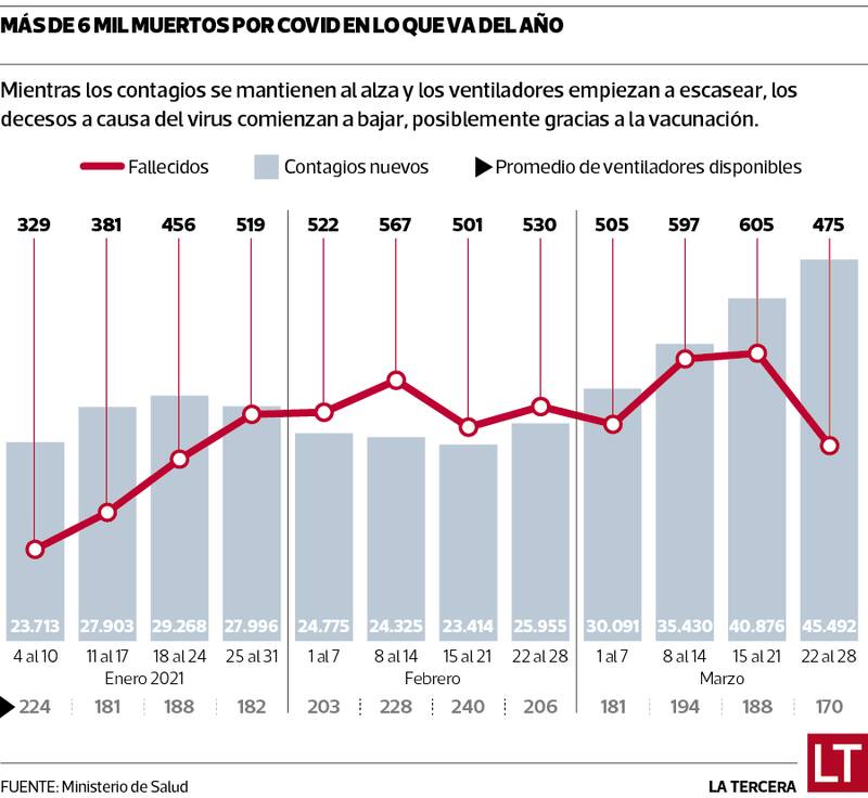 Pese a eso, esta semana hubo una reducción en la cantidad de muertos (475) respecto a semanas anteriores (ver infografía), lo que podría ser atribuido al avance de la campaña de vacunación en los segmentos de mayor edad, lo que ha hecho que baje la presencia de personas mayores de 70 años en las UCI.
