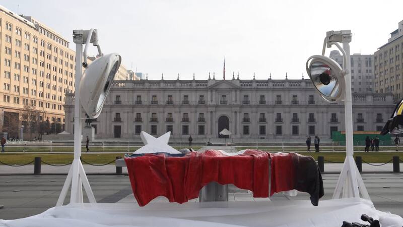 Esta mañana, una intervención artística se apostó frente a La Moneda. La obra cuenta con una bandera chilena con la estrella sobresaliente, recostada sobre una camilla, con luces apuntando hacia ella y el piso está cubierto con un manto blanco, simulando así un pabellón quirúrgico.