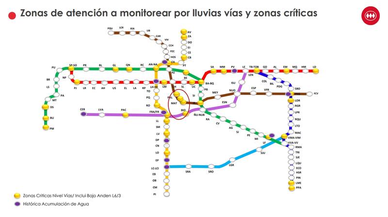 - Línea 6: Se marca como zona crítica las estaciones Biobío y Pedro Aguirre Cerda, mientras que Cerrillos es marcada como “histórica de acumulación de agua”.