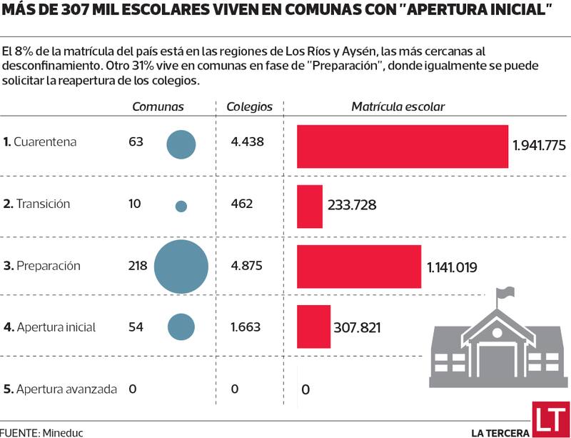 El ministro de Educación, Raúl Figueroa, explica que, en la práctica, cualquier colegio puede actualmente solicitar su reapertura, pero la autorización se analiza caso a caso. Por ejemplo, no podrían reabrir los 4.900 colegios ubicados en comunas que están en las dos primeras fases del plan “Paso a Paso” (cuarentena y transición), donde hay 2,2 millones de escolares.