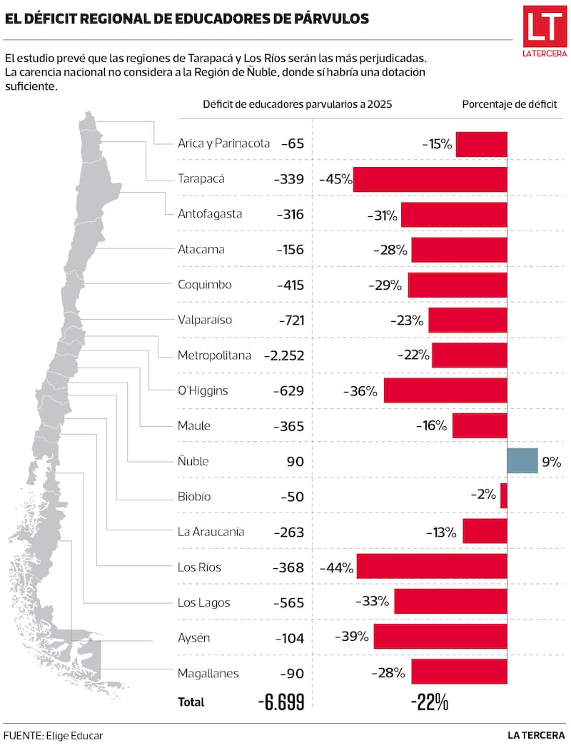 En base a esos datos, las organizaciones realizaron un estudio que prevé que al 2025 habrá un déficit de 22% en la dotación de educadores parvularios, los que hoy suman 27 mil en el país. Las regiones más afectadas serían las de Tarapacá y O’Higgins.